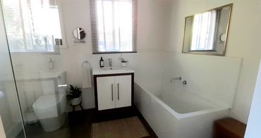 The cottage has all the comforts of home, and features a lounge/dining room with a cosy wood fire, ceiling fans, heating, well-equipped kitchen, newly renovated bathroom including bath, and laundry.